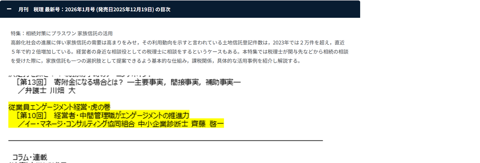 『月刊税理』では、毎年テーマを定めた連載企画が複数設けられています。2025年の「虎の巻」シリーズは、「従業員エンゲージメント経営」をテーマに、全12回で構成されています。Sai10はその第10回を担当し、「経営者・中間管理職がエンゲージメントの推進力」というテーマで執筆する機会を得ました。これまでに掲載された内容(目次)は、次のURLから確認できます。